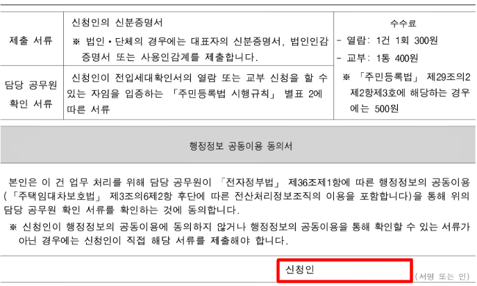 - 교부:해당 물건지 건당 400원(소유자, 임차인, 매매계약자) 혹은 500원(신용기관, 감정기관, 경매참가자)