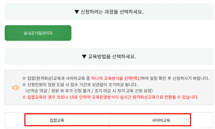 실내 공기질 관리자 집합교육 및 사이버교육 신청 방법입니다.