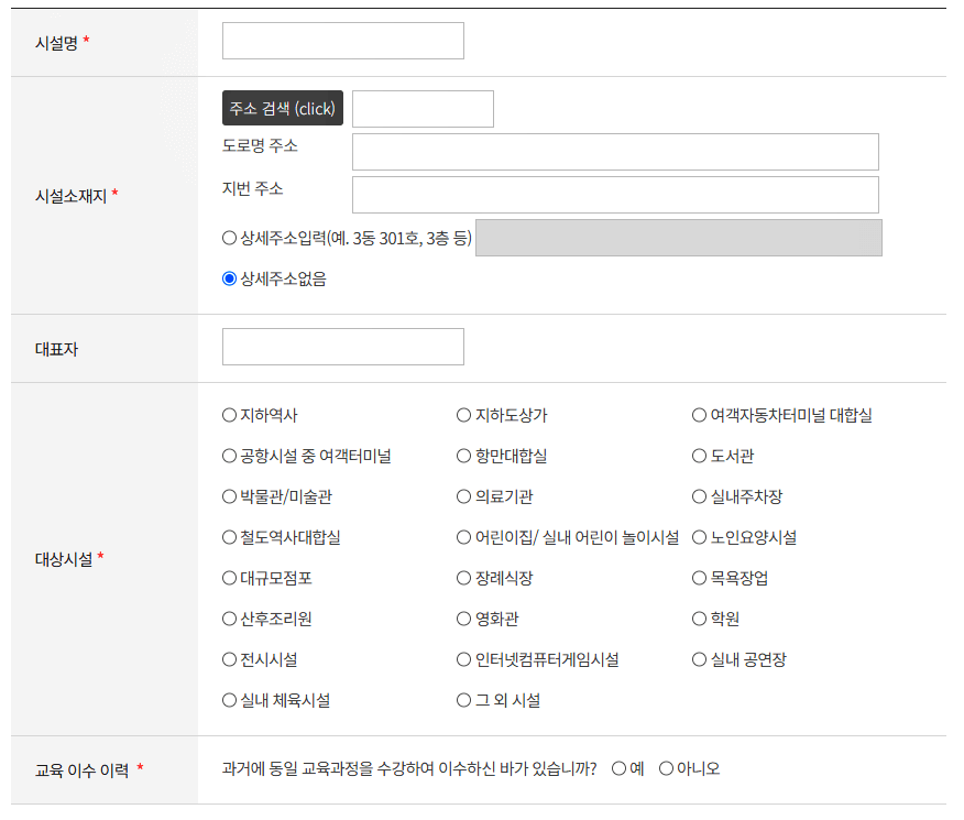 | 신규교육 | 다중이용시설의 소유자(관리책임자)로 임명된 날부터 1년 이내에 1회 |