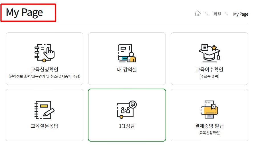 8. 신청내용, 강의 듣기는 우측 상단 마이페이지에서 확인할 수 있습니다.